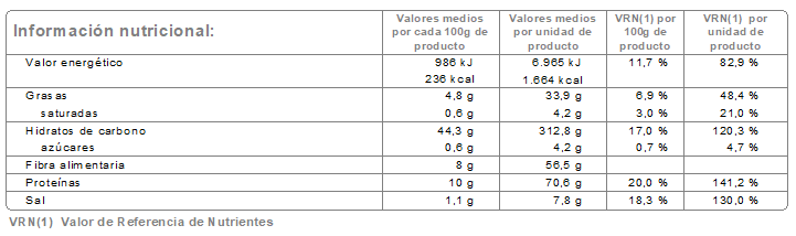 Ingredientes: Ingredientes: Harina integral trigo* 60% (gluten), harina de trigo* 20%, harina de centeno (gluten)* 10%, harina integral avena (gluten)* 10%, agua , masa madre 20% (harina de trigo* y centeno* integral y agua), mezcla de semillas* 5% (lino dorado , semillas de lino marrón, semillas de calabaza , semillas de amapola), aceite de oliva virgen extra*,  sal*, levadura, mejorante eco (harina de trigo*, E300, enzima) y malta de centeno*.